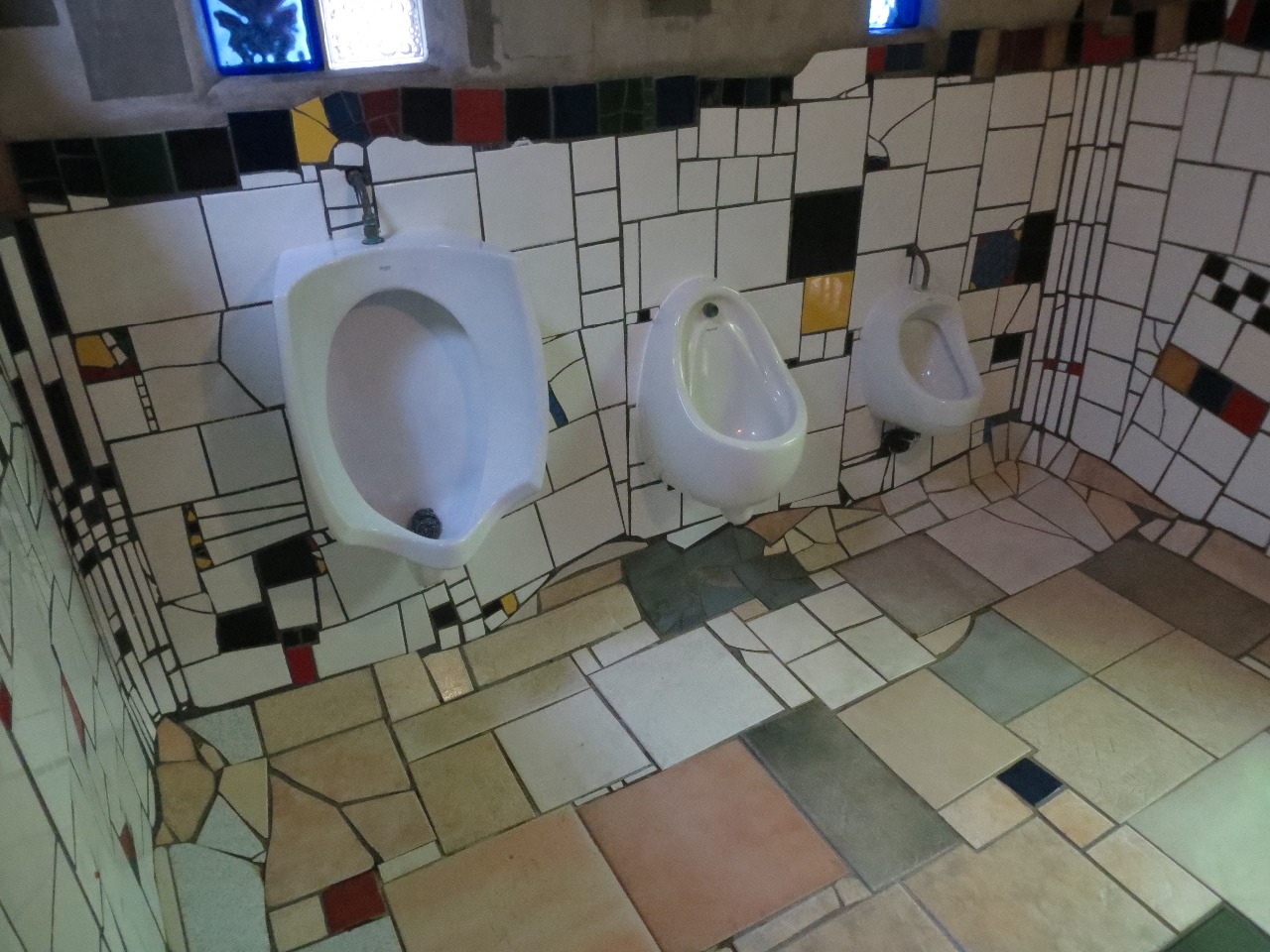 Am Morgen nach Moerewa fahren wir also Richtung Opua, aber nicht ohne einen Stopp in Kawakawa einzulegen. Hier hat nämliche eine in Deutschland sehr bekannte Person, der Künstler Friedensreich Hundertwasser, die letzten dreißig Jahre seines Lebens in einer Hütte ohne Elektrizität verbracht. Dem Ort hat er, und das gilt hier eigentlich als Hauptattraktion, wunndervolle öffentliche Toiletten gestaltet – die wahrscheinlich schönsten in ganz Neuseeland! Deshalb haben wir natürlich genau hier, für unsere morgentliche Kosmetikpause angehalten und uns frisch gemacht.